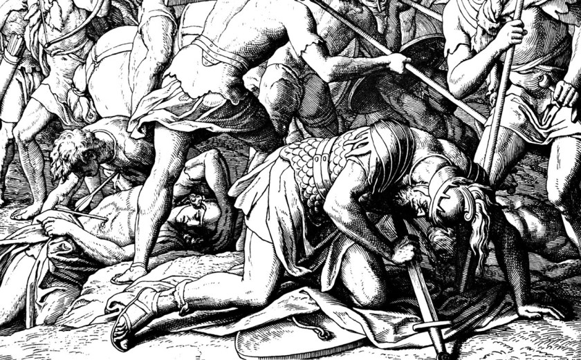 E Shaul disse al suo scudiero: «Sfodera la spada e trafiggimi, prima che vengano quei non circoncisi a trafiggermi e a schernirmi». Ma lo scudiero non volle, perché era troppo spaventato. E Shaul prese la spada e vi si gettò sopra. Quando lo scudiero vide che Shaul era morto, si gettò anche lui sulla sua spada e morì con lui. E morirono insieme in quel giorno Shaul e i suoi tre figli, lo scudiero e tutti i suoi uomini (31:4-6).