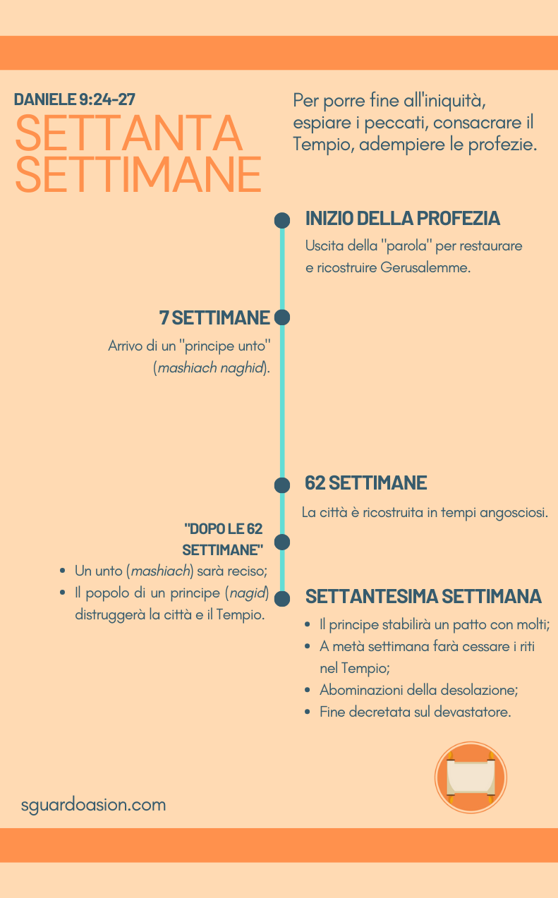 Fa' dunque attenzione alla parola e intendi la visione: Settanta settimane sono fissate per il tuo popolo e per la tua santa città, per fermare la trasgressione, per sigillare il peccato, per espiare l'iniquità, per portare giustizia perpetua, per sigillare visione e profeta e per ungere il Santo dei Santi.